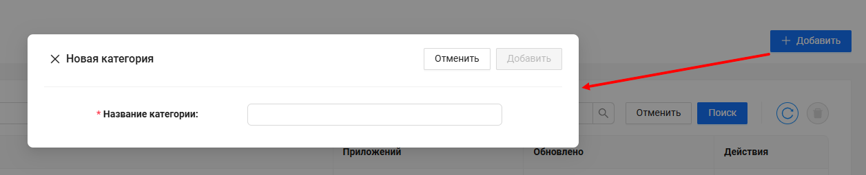 Чтобы добавить новую категорию, на странице Категории нажмите кнопку «Добавить». В открывшемся модальном окне заполнить поле “Название категории” и сохранить. После добавления категория отобразится в общем списке.