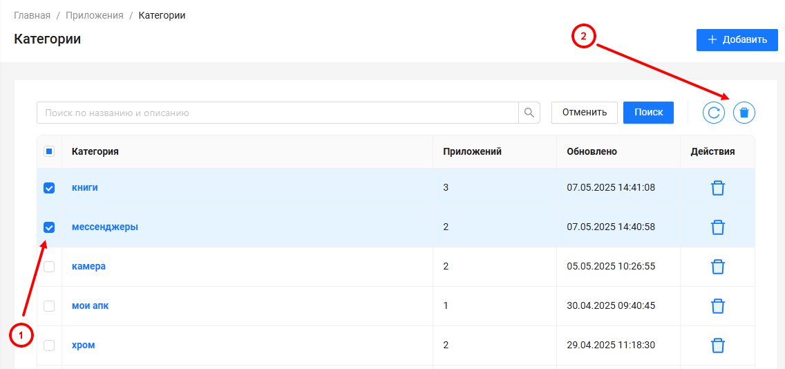 1. Массовое удаление. Администратор может выполнить массовое удаление объектов, для этого необходимо в списке отметить нужные категории галочками и нажать кнопку “Удалить”.