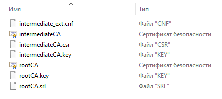openssl x509 -req -in "intermediateCA.csr" -CA "rootCA.crt" -CAkey "rootCA.key" -CAcreateserial -out "intermediateCA.crt" -days 1825 -sha256 -extfile "intermediate_ext.cnf" -extensions v3_ca- В результате всех действий должен получиться список файлов: