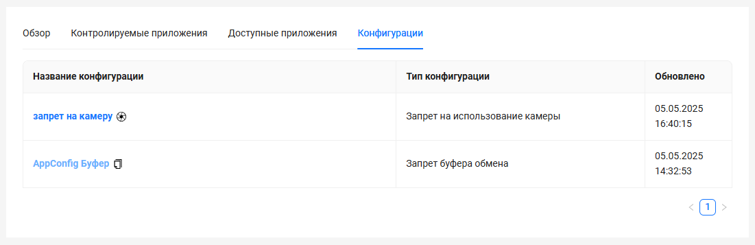 Во вкладке Конфигурации перечислен список конфигураций, назначенных на это устройство. При нажатии на название конфигурации открывается страница редактирования/просмотра конфигурации.