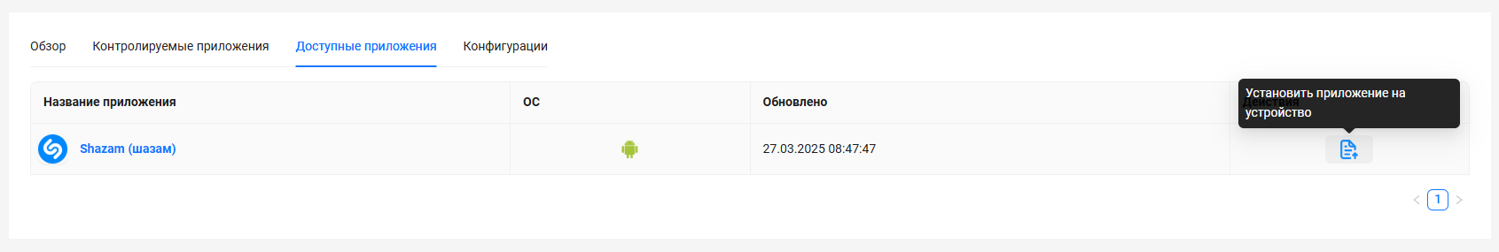 Администратор может установить приложение на устройство, нажав на кнопку “Установить приложение” в столбце Действия.