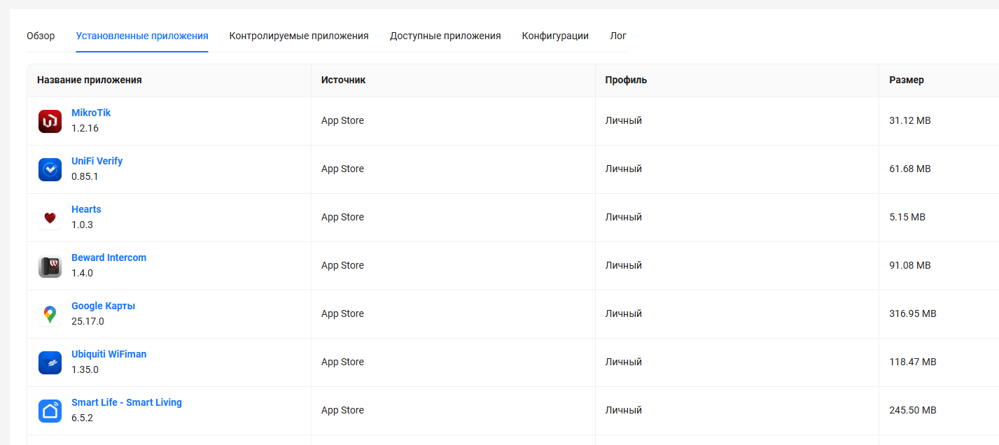 Во вкладке Контролируемые приложения отображается список приложений, установленных на устройство через MDM.