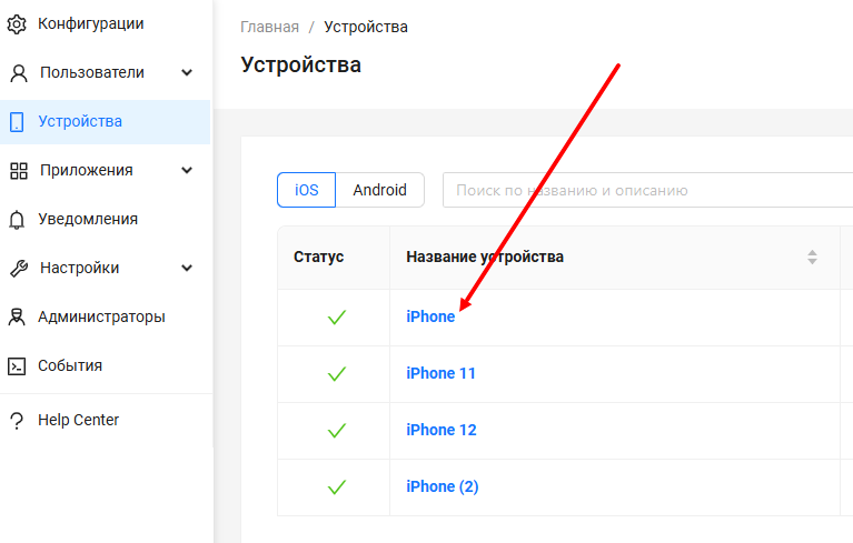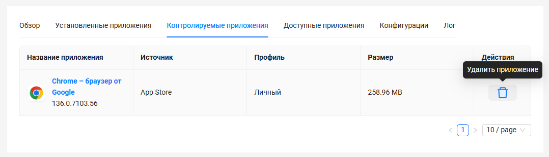 Администратор может удалить установленное приложение с устройства, нажав на кнопку “Удалить приложение” в столбце Действия.