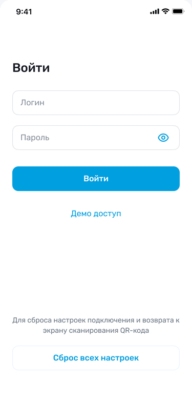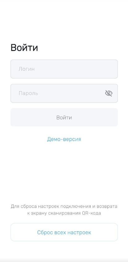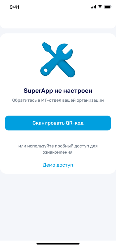 Пользователь может воспользоваться демо-версией приложения без подключения к корпоративному серверу. Это позволит ознакомиться с интерфейсом и основными функциями SuperApp, без сканирования QR-кода и ввода учетных данных.