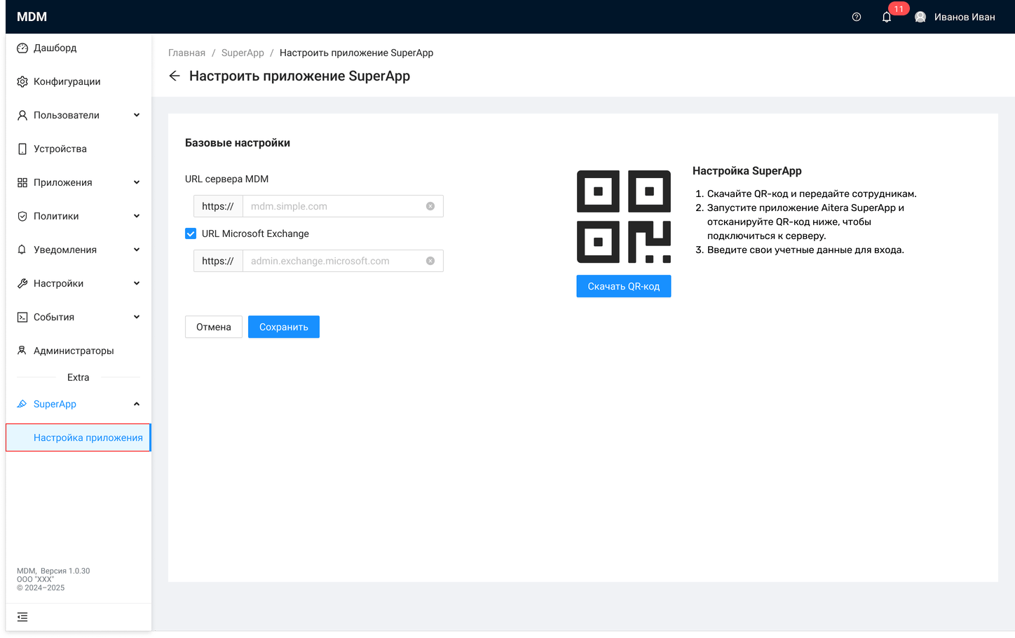 Для этого в административной панели Aitera MDM нужно открыть раздел SuperApp -> Настройка приложения и в форме указать необходимые параметры:
