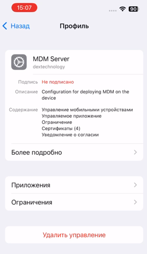 После регистрации iOS-устройства в системе MDM, на него автоматически устанавливаются приложения и настройки, назначенные администратором. Устройство становится управляемым в рамках корпоративной политики.