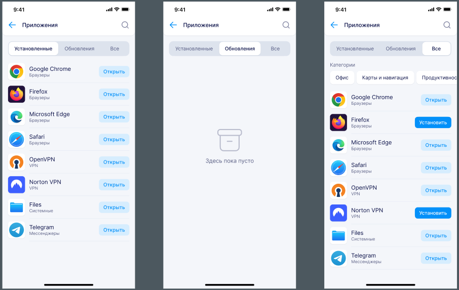 - Приложения (только для iOS): Теперь этот раздел активен, и пользователь может заходить в список доступных приложений.