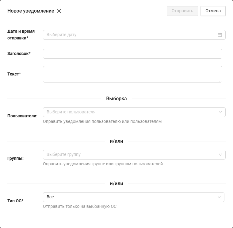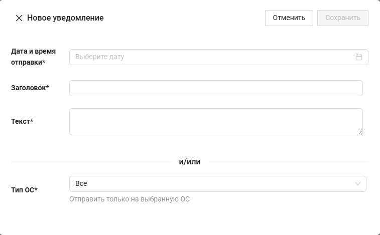 В разделе Уведомления есть кнопка “Отправить уведомление”. При нажатии на нее открывается модальное окно с полями для заполнения.