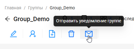 Для отправки уведомление всем пользователям группы нужно нажать на кнопку “Отправить уведомление группе”, заполнить поля в модальном окне и нажать “Сохранить”.