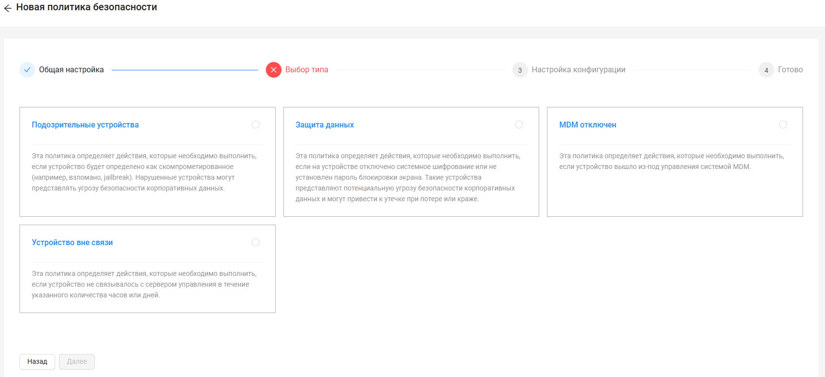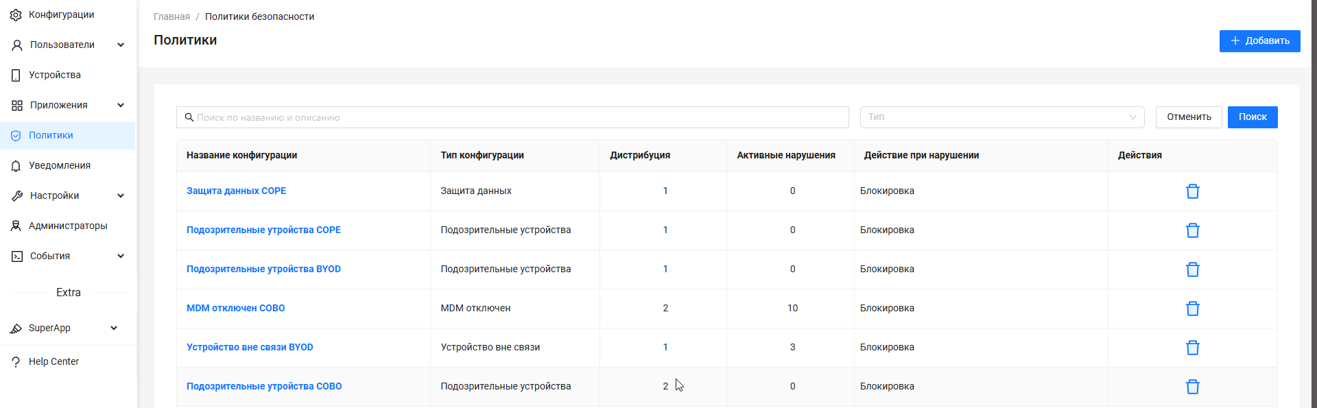 Политики безопасности это набор настроек, состоящих из правил и действий по отношению к управляемым устройствам. Система автоматически применяет меры, когда устройство нарушает установленные правила.