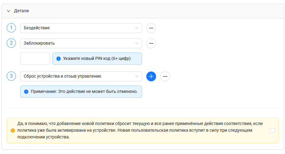 | MDM отключен | Эта политика определяет действия, которые необходимо выполнить, если устройство вышло из-под управления системой MDM. |