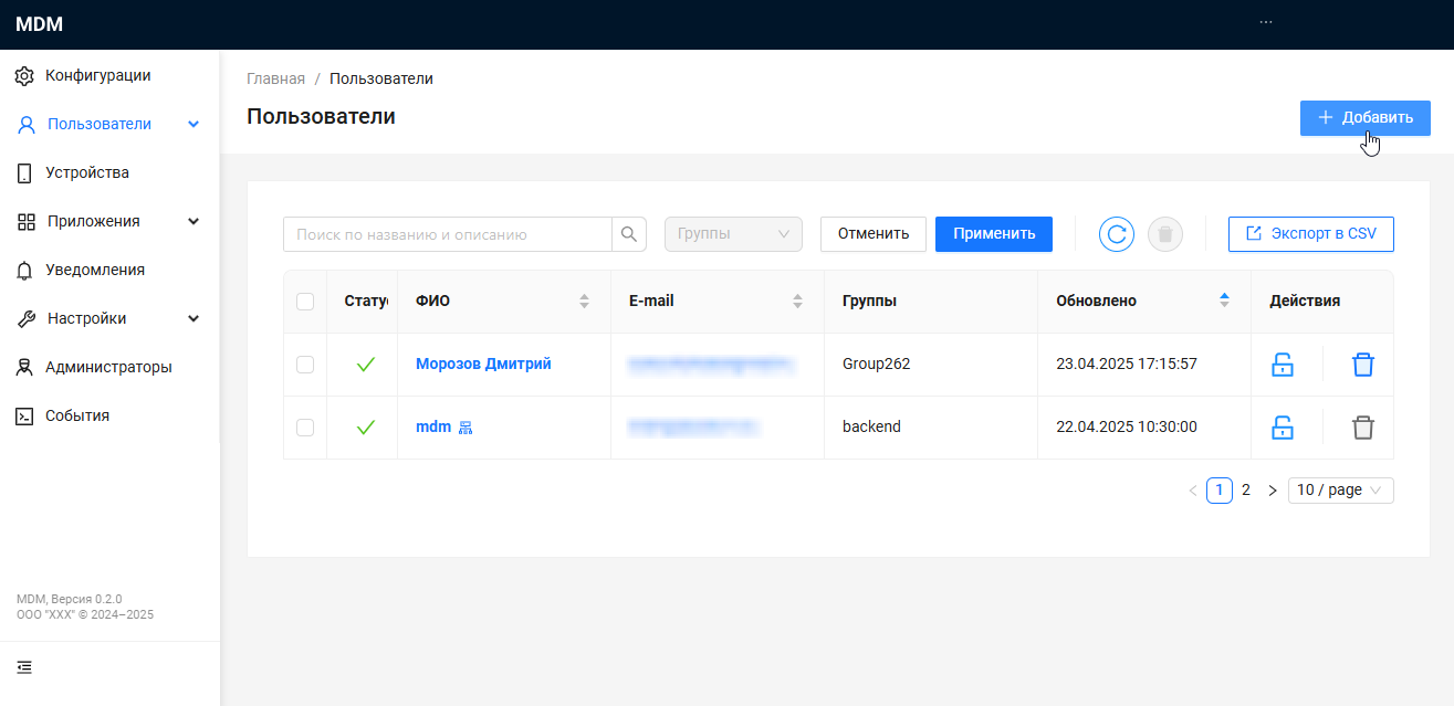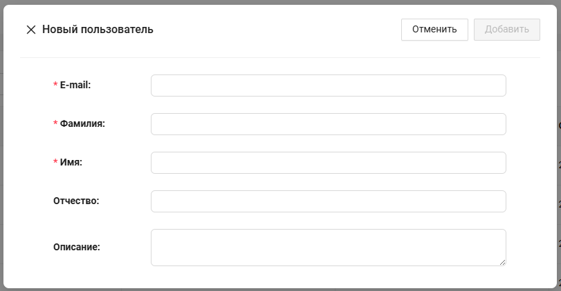 После заполнения обязательных полей нажмите кнопку “Добавить”. После добавления пользователь отобразится в общем списке.