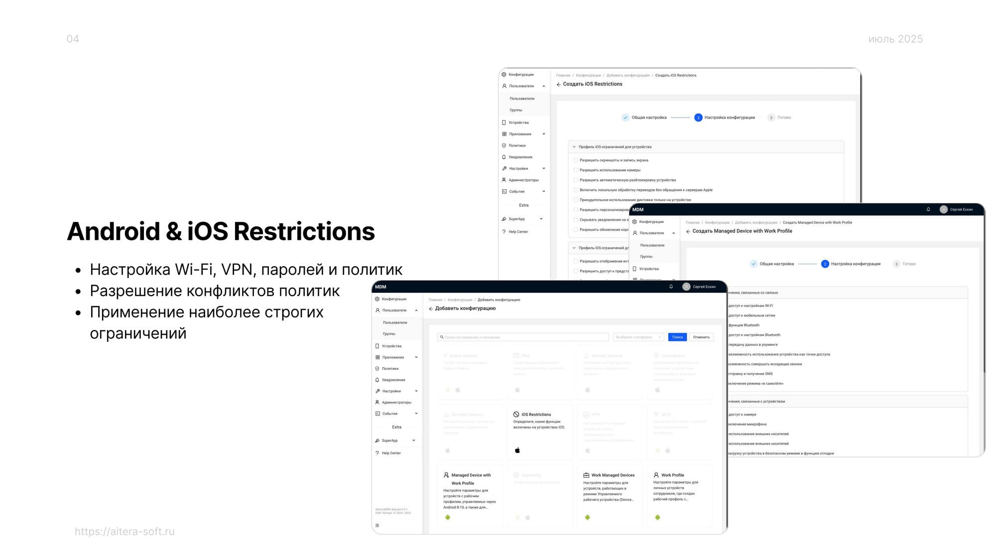 • Реакции на нарушения: блокировка устройства, отвязка от MDM, уведомления о нарушениях.