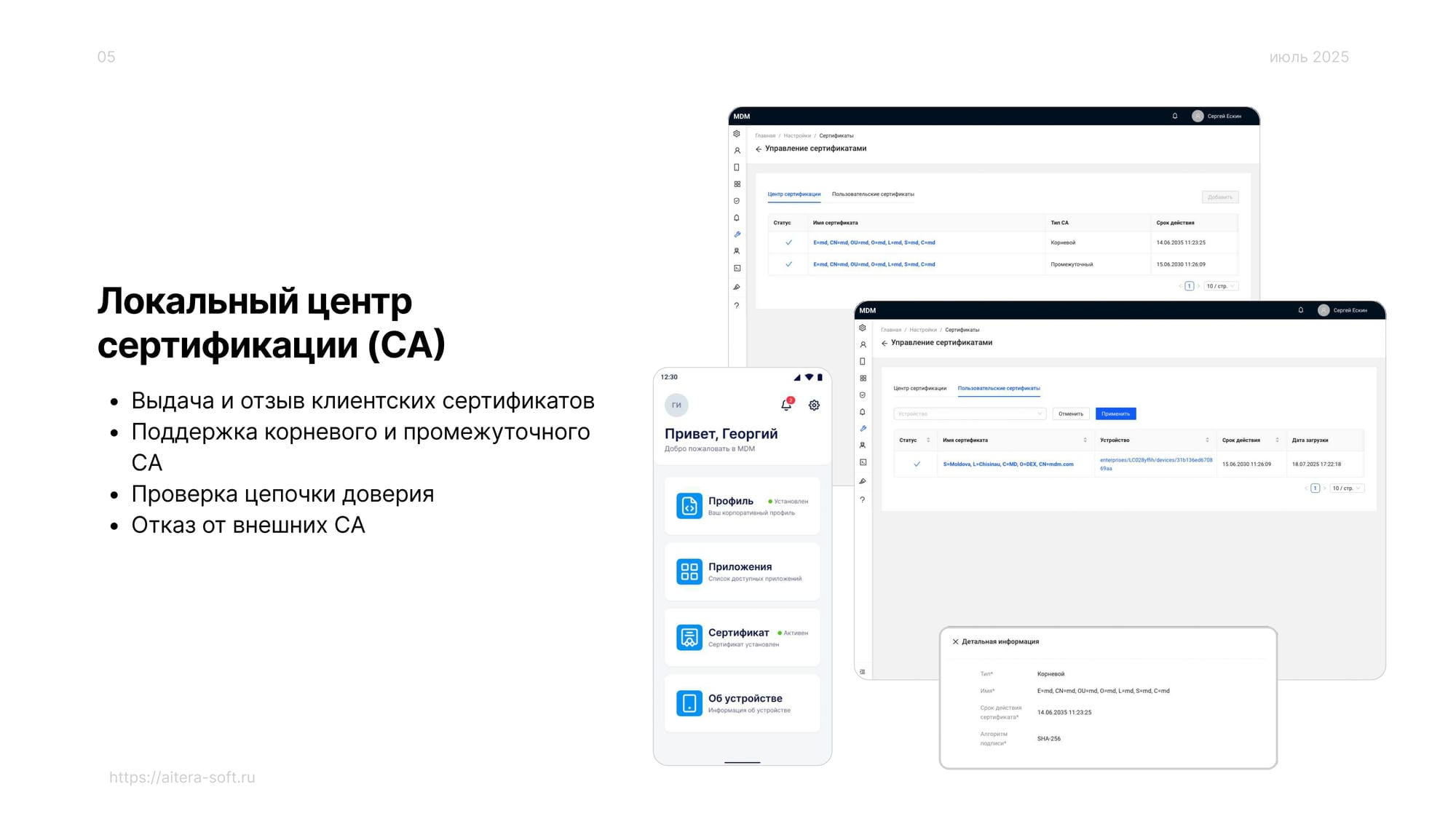 • Исключена необходимость взаимодействия с внешними CA — вся инфраструктура сертификатов поддерживается внутри компании.
