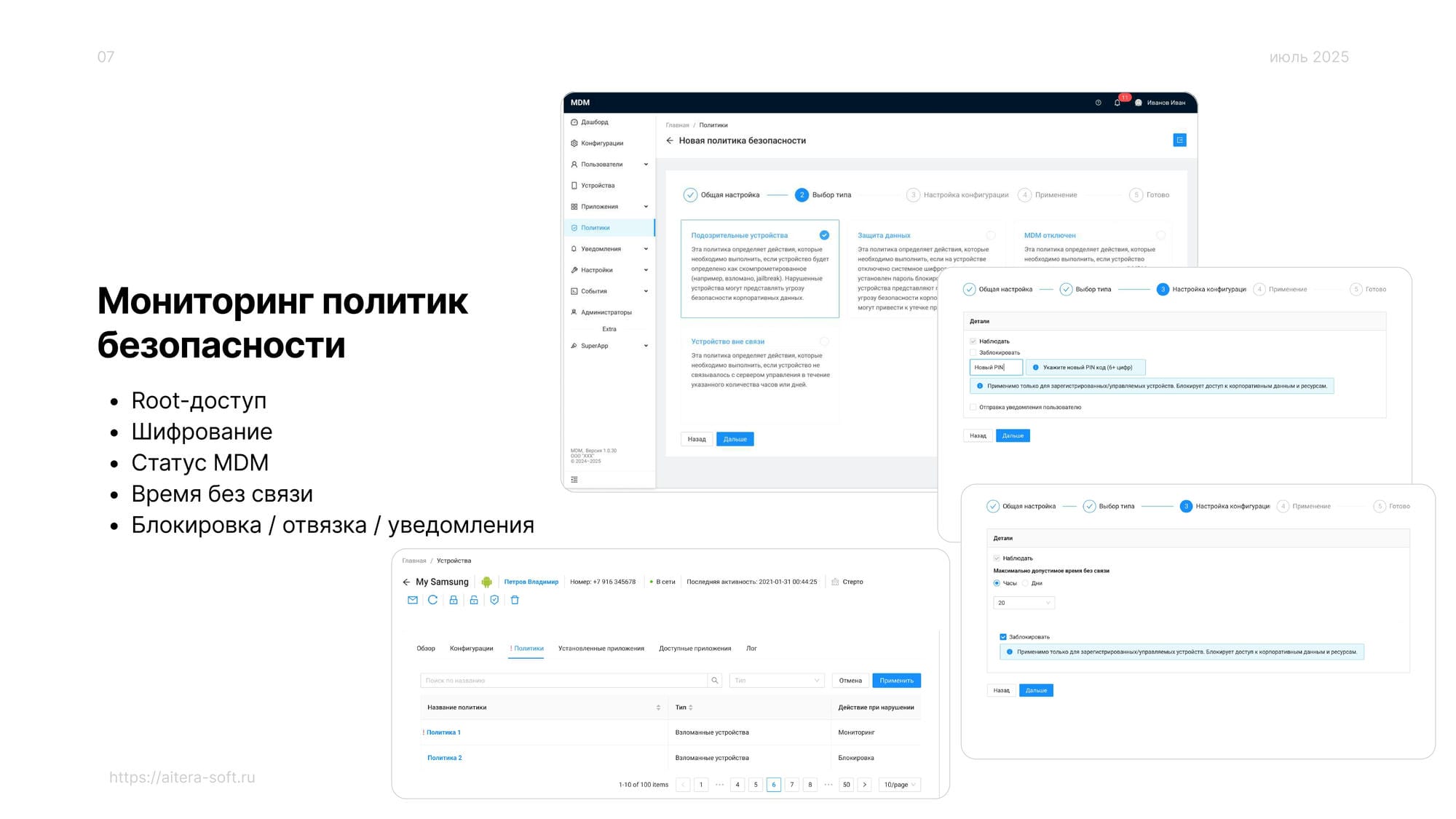 • Политики: обнаружение root-доступа, отсутствие шифрования, отключение MDM, отсутствие связи.